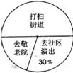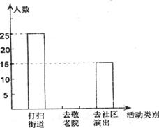 今年3月5日,某中学组织全体学生参加了“走出校门,服务社会”的活动。七年级一班高伟同学统计了该天本班学生打扫街道、去敬老院和到社区演出的人数,并做了如下直方图和扇形统计图。请根据高伟同所作的两个图形,解答: