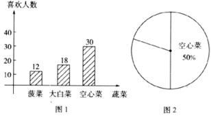 如图,图1是某中学九年级(一)班全体学生对三种蔬菜的喜欢人数的频数分布直方图.