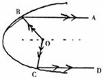 根据探照灯的原理,从点O照射到曲线上的光线OB,OC等反射以后沿着BA和CD的方向射出,且AB∥CD,如果∠ABO=45°,∠DOC=88°,求光线OB和DC之间的夹角∠BOC的度数。
