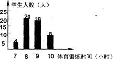 13、为了了解贯彻执行国家提倡的“阳光体育运动”的实施情况,将某班50名同学一周的体育锻炼情况绘制成了如图所示的条形统计图,根据统计图提供的数据,该班50名同学一周参加体育锻炼时问的中位数与众数之和为__________。