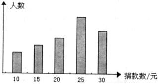 25.(本题满分8分)四川汶川大地震牵动了人民的心,某市广大中学生纷纷伸出了援助之手,为抗震救灾踊跃捐款。该市振兴中学某班的学生对本校学生自愿捐款活动进行抽样调查,得到了一组学生捐款情况的数据。下图是根据这组数据绘制的统计图,图中从左到右各长方形的高度之比为3︰4︰5︰8︰6,又知此次调查中捐款25元和30元的学生一共42人。