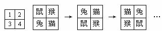 8、四个电子宠物排座位,一开始,小鼠、小猴、小兔、小猫分别坐在1、2、3、4、号座位上(如图所示),以后它们不停地变换位置,第一次上下两排交换,第二次是在第一次换位后,再左右两列交换位置,第三次上下两排交换,第四次再左右两列交换……这样一直下去,则第2009次交换位置后,小兔子坐在( )号位上。