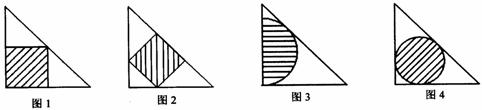 8、如图,甲、乙、丙、丁四位同学从四块全等的等腰直角三角形纸板上裁下四块不同的纸板(阴影部分),他们的具体裁法如下:甲同学:如图1所示裁下一个正方形,面积记为S1;乙同学:如图2所示裁下一个正方形,面积记为S2;丙同学:如图3所示裁下一个半圆,使半圆的直径在等腰Rt△的直角边上,面积记为S3;丁同学:如图4所示裁下一个内切圆,面积记为S4。则下列判断正确的是( )