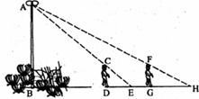 如图,花丛中有一路灯杆AB在灯光下,小明在D点处的影长DE=3米;沿BD方向行走到达G点,DG=5米,这时小明的影长GH=5米。如果小明的身高为1.7米,求路灯杆AB的高度(精确到0.1米)。