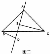 (2)若B、C在DE的两侧(如图二所示),其他条件不变,AB与AC仍垂直吗?若是请给出证明;若不是,请说明理由。