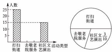 28.(本题7分)今年3月5日,大庆某中学组织全体学生参加了“走出校门,服务社会”的活动.七年级一班高伟同学统计了该天本班学生打扫街道,去敬老院服务和到社区文艺演出的人数,并作了如下条形统计图和扇形统计图.请根据高伟同学所作的两个图形,解答:
