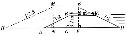 26.(10分)如图,拦水坝的横断面为梯形ABCD,坝顶宽BC为6 m,坝高为3.2 rn,为了提高水坝的拦水能力,需要将水坝加高2 m,并且保持坝顶宽度不变,迎水坡CD的坡度不变,但是背水坡的坡度由原来的i=1:2变成i’=1:2.5(有关数据在图上已注明).求加高后的坝底HD的长为多少。