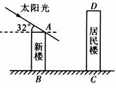 25.(10分)如下图所示,某居民小区有一朝向为正南方向的居民楼,该居民楼的一楼是高6 m的小区超市,超市以上是居民住房,在该楼的前面l5 m处要盖一栋高20 m的新楼.冬季正午的阳光与水平线的夹角为32°.