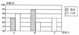17.A、B、C三名大学生竞选系学生会主席,他们的笔试成绩和口试成绩(单位:分)分别用了两种方式进行统计,如表一和图一: