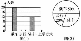 17.学习了统计知识后,小刚就本班同学的上学方式进行了一次调查统计.图(1)和图(2)是他通过采集数据后绘制的两幅不完整的统计图.请你根据图中提供的信息,解答以下问题: