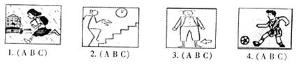 (一)句子理解。录音中有四组句子,每组句子读一遍,然后从每组的A、B、C三个句子中选出一个与图画内容相符合的选项。(共4小题,计4分)