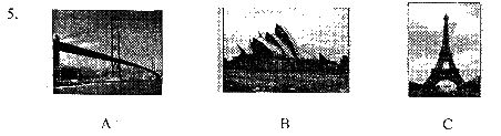 (一)录音中有五个句子,每个句子听两遍,然后在每小题A、B、C三个选项中选出你所听剑的单词或与句子内容一致的图片。