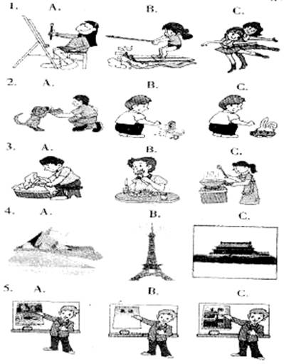 一)请听对话,根据所听内容选择与其意思相符的图画。对话读一遍。(5分)