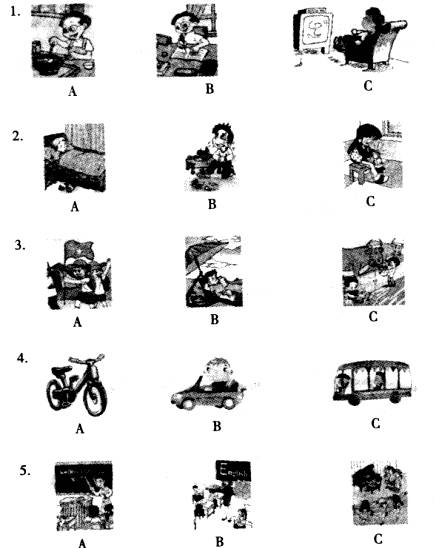 (一)录音中有五个句子,每个句子读两遍,然后从每小题的A、B、C中选择与你所听到的内容相符的图片。