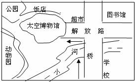 Eric是一位来自美国的交换生,你和他约好今天去参观太空博物馆。由于Eric不熟悉周围环境,请你根据图示告诉他去太空博物馆的路线,并提醒他不要迟到。