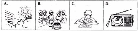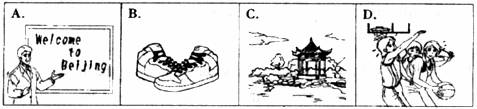 请看第一组的四幅图片。听三个句子,完成1-3小题。