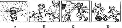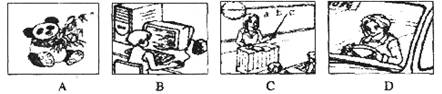 请看第一组的四幅图片,听三个句子,完成第l至第3小题。