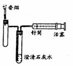 (1)小刚同学设计了右图所示的实验装置。该装置中的澄清石灰水可以检验香烟燃烧是否有气体生成。为了使香烟燃烧产生的气体通过澄清石灰水,活塞应向 移动。
