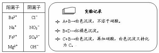 40.(5分)现有A、B、C、D四种溶液,它们分别由左下表中的阴、阳离子构成,其中每一种离子只存在于一种溶液中。请根据实验记录进行推断: