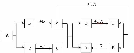 A~H为初中所学的常见化合物,它们之间的相互转化关系如图所示(其中反应条件和生成物中的水已略去)。已知:A是一种建筑材料的主要成分;B是一种常见气体,H是一种含钠的化合物。