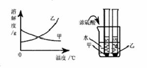 10、甲、乙两种固体物质的溶解度曲线如图所示。现将两支分别装有甲、乙两种物质饱和溶液(底部均有未溶解的固体)的试管浸入盛有水的烧杯里,然后向烧杯中加入一定量的浓硫酸,则对相关变体判断正确的是 ( )