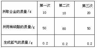18、(4分)为了测定某铜锌合金的组成,某校化学课外活动小组利用该合金粉末与稀硫酸反应,进行了三次实验,所得相关的实验数据记录如下: