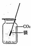24. (2分)刘慧同学在一本参考书上发现,镁居然能在二氧化碳气体中燃烧,于是她迫不及待地做起了这个实验:将镁条点燃后迅速伸入盛有二氧化碳的集气瓶中,发现镁条剧烈燃烧,发出白光,放热,产生一种白色粉末和一种黑色粉末。