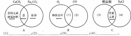 13.(4分)图A中的两个圆分别表示CaC03和Na2C03的有关信息,两圆重叠的区域表示它们的共同特征(相似点),重叠区域以外的部分表示它们的独有特征(不同点)。请你在图下横线上填写与图B、图C中的(1)、(2)、(3)、(4)处相适应的内容(每处只要求填一点)。