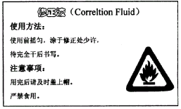 38. (2分)下图为大家经常使用的某品牌修正液标签上的部分文字和图片。请分析、推测该修正液的性质(至少答出两点):