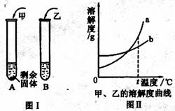 14.(2分)t℃时,分别向盛有10 g水的A、B两支试管中,加入等 质量的甲、乙两种固体物质(均不含结晶水),使其充分溶解,可观察到如右图I所示的现象。请思考: