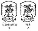 写出反应的化学方程式_________________________________。 20.证明“光合作用需要二氧化碳的实验”可利用右图所示的甲(玻璃缸中盛NaOH溶液)、乙(玻璃缸中盛清水)两个装置,将这两个装置同时放在黑暗处一昼夜,然后一起放到阳光下,几小时后,检验甲装置中植物的叶片没有新的淀粉生成,而乙装置中植物的叶片却有新的淀粉生成。其原因是甲装置里的CO2 ,反应的化学方程式是 。
