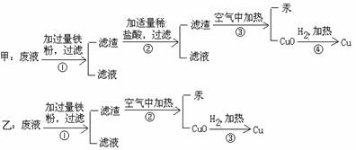 ⑶加热CuO之前必须进行的操作是______________________________________________。 27.化学实验室有含Hg2+、Fe3+、Cu2+等金属离子的废液,甲、乙两位同学设计从废液中回收金属汞和铜的实验方案如下: