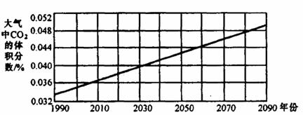 (4)下面是大气中CO2含量按目前速度上升的直线图。请根据该图估计:到2050年时,大气中CO2的体积分数是 %,这比2000年CO2体积分数0.035%增加了 %。