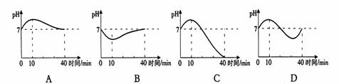 24、(05年泉州)人体口腔内唾液的pH通常约为7,在进食过程的最初10分钟,酸性逐渐增强,之后酸性逐渐减弱,至40分钟趋于正常。与上述事实最接近的图象是 ( )。