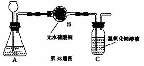 38.某纯碱含有氯化钠杂质,为了测定纯碱的纯度,小明按如图装置进行实验。B 、C 装置中的物质均充足。现取6克样品放人锥形瓶,加适量蒸馏水使之完全溶解,从长颈漏斗加人10%的稀硫酸,直到不再产生气体为止。C 装置质量在反应前为220克,反应后为222.2 克.请回答下列问题: (1)B装置的作用是吸收水分,发生的化学反应是CuSO4+ 5H2O = CuSO4·5H2O ,该反应属于___________(填字母)
