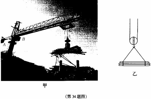 34.(6分)“塔吊”是现在建筑工地上常见的起重设备,用“塔吊”可将重物方便地安放到工作区内,如图甲所示。现有一“塔吊”,它有一水平臂AD,水平臂AD可分为AB和BD)两部分,AB叫平衡臂,BD叫吊臂。A端装有配重体,它的质量m=5吨。C处装有可在水平臂BD上移动的滑轮组,C移动的范围是从月点到D点。已知:AB=10米,BD=50米。若“塔”身的宽度和铁架、滑轮组的重力及摩擦均不计,请计算并回答下面的问题: