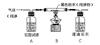 29、某纯净气体通过下图装置时,可观察到:A中紫色石蕊试液不变色,C中澄清石灰
