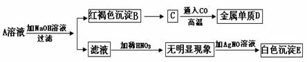 请填写下列空白:⑴物质A的化学式为_______;⑵A溶液与氢氧化钠溶液反应的基本类型是_______;⑶由C转化为D的化学方程式为____________________________。