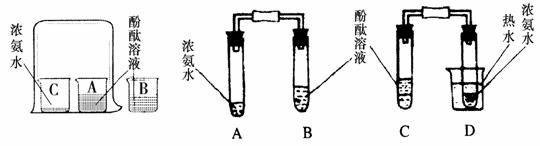 c.在B、C试管内分别倒入5mL烧杯中的酚酞溶液(烧杯中剩余的酚酞溶液用于实验中作比较)。然后在空烧杯中倒入适量的热水备用。另在A,D试管中分别倒入2mL浓氨水,立即用带橡皮塞的导管按实验图2连接好,并将D试管放置在热水中,观察几分钟,