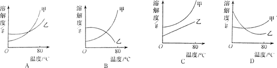 甲、乙两种物质在0℃-80℃范围内,同一温度下,不能配制成质量分数相同的饱和溶液的溶解度曲线图是下列图中的: