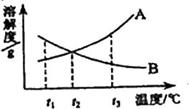 15.A、B两种物质的溶解度曲线如图所示:t3℃时,将A、B分别溶于1oog水中,各自配成饱和溶液.然后降温.试根据溶解度曲线判断.下列说法错误的是