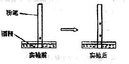 处点一滴蓝墨水.将粉笔插入盛有酒精的培养皿中。过了一段时间,吴梁发现随着酒精的上升,蓝墨水也在粉笔上不断移动,最后蓝墨水在粉笔上分为两个区域,上半部分是蓝色,下半部分是紫色(如下图所示)。根据上述现象回答下列问题: