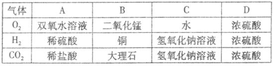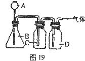 42、(5分)某同学设计了图19装置制取表中的三种干燥、纯净的气体。图中铁架台、铁夹及气体收集装置都已略去,A、B、C、D表示相应仪器中加入的试剂。