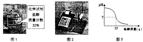 18.(3分)为测定标示质量分数为32%的盐酸(下图1)的实际质量分数,小明用pH测定仪组成实验装置(图2)。实验时先在烧杯中加入20 g 40%的氢氧化钠溶液,再逐滴加入该盐酸,测定仪打印出加入盐酸的质量与烧杯中溶液pH的关系图(图3)。