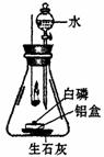 (1)取一小块白磷(着火点为40℃),放在一铝箔制的小盒中,将其放入装有生石灰的锥形瓶内。点燃蜡烛,观察现象。 |