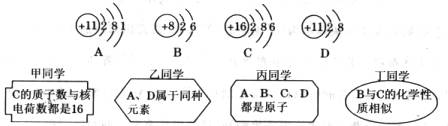 (2)课堂上,老师给出了A、B、C、D四种粒子(微粒)的结构示意图(如下图所示),同学们畅所欲言,纷纷发表了自己的看法。下面列举了四名同学的观点: