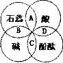 14.小李在学习酸碱指示剂与常见酸、碱溶液作用时,归纳成如下图所示的关系。图中A、B、C、D是两圆相交的部分,分别表示指示剂与酸、碱溶液作用时所显示出的颜色,则其中的表示不正确的是