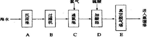 33.用蒸馏法淡化海水,必须对海水进行预处理。预处理的主要目的是除去海水中的细菌、二氧化碳、氧气、泥沙、悬浮物和可溶性碳酸盐及碳酸氢盐等。碳酸盐利碳酸氢盐是用硫酸来除去。试说明图中A-E各步骤的作用。