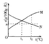 12.根据M、N两种物质的溶解度曲线,往100g水中加入质量都是ag的M和N两种物质(假设两种物质的溶解性互不影响),制成t2温度下的混合物,将该混合物的温度降低到t1,下列说法不正确的是 ( )