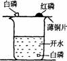 在500mL的烧杯中注入400mL开水,并投入一小块白磷。在烧杯上盖一薄铜片,铜片上端放一小堆干燥的红磷,另一端放一小块已用滤纸吸去表面水的白磷。如图所示。一段时间后,可看到的现象是 。若将氧气通入烧杯底部与白磷接触,可看到的现象是 。通过这个实验,说明可燃物燃烧的条件是 ,从这个实验里,我们可以知道白磷应保存在 中。